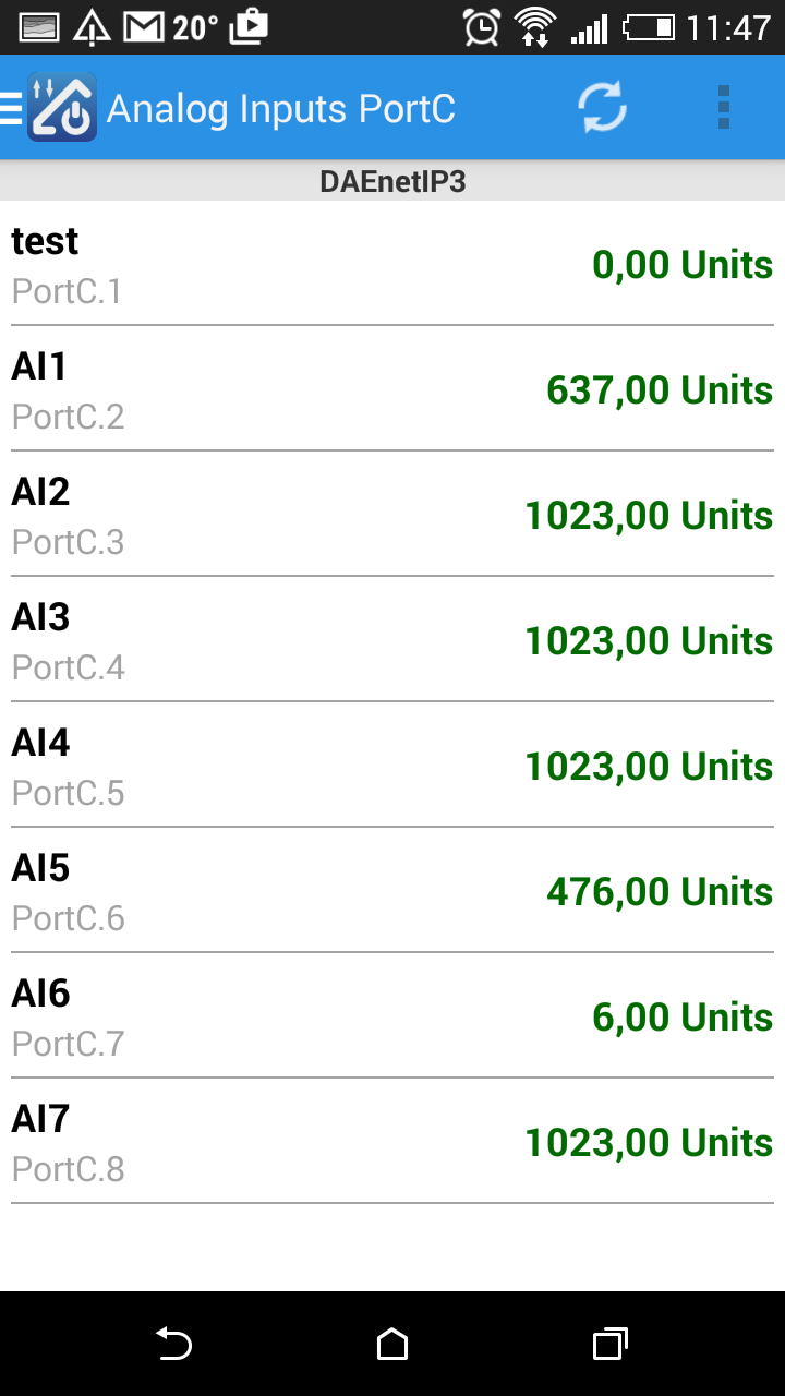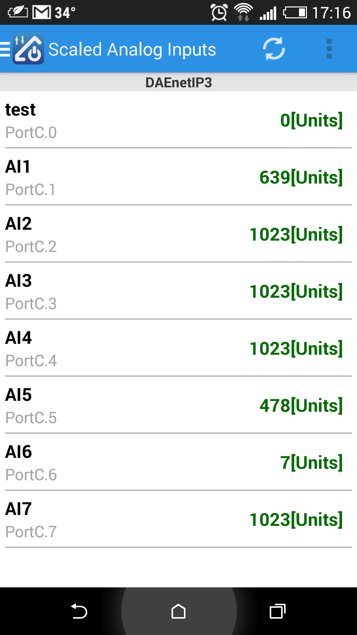 The page below the text shows the page for the analog inputs. Their states are automaticaly refreshed each 2-3 seconds. The user doesn't have to click refresh button each time but just tracks the I/O changing values almost in real time (Ajax).